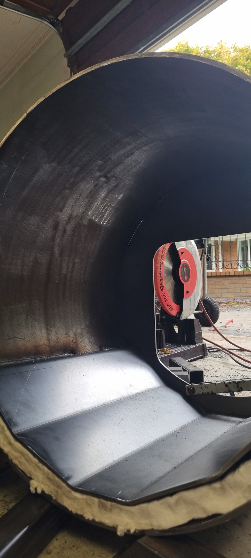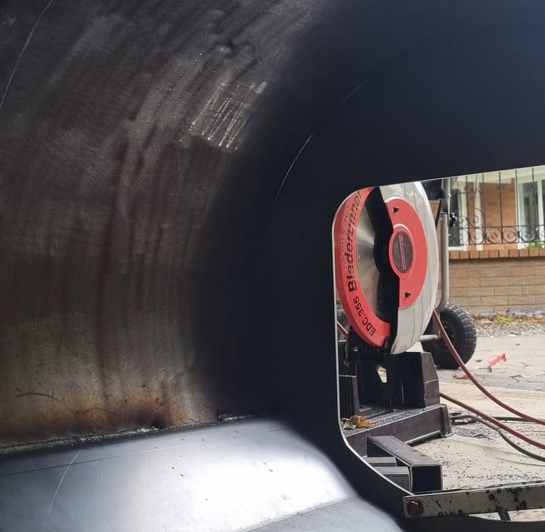 It starts by getting all of the materials we need, including the massive pipe you see getting unloaded from the trailer. While it looks old and rusty, this pipe is brand new!! We then spend hours cutting the pipe into sections the right size for the smoker we are building. Then we make our base, usually out of heavy-duty box section, to support the weight of the smoker and keep everything level. Once the base is squared and welded, we mount the main chamber and begin fabricating the firebox.